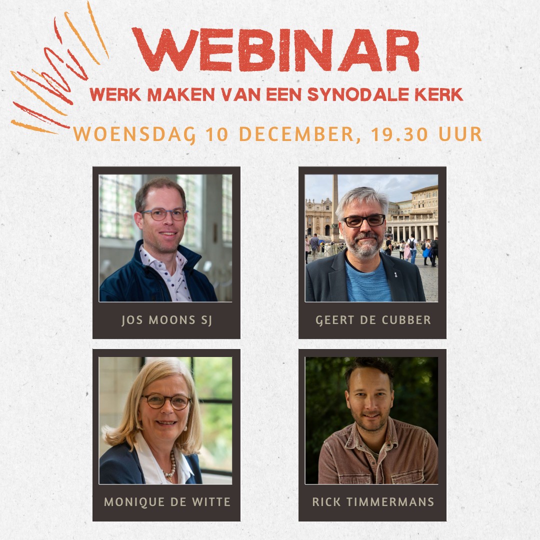 Tijdens dit interactieve Webinar gaan we in gesprek over de toekomst van een synodale kerk. Wat vraagt dit van onze houding, structuren en spiritualiteit? Hoe kun je er concreet mee aan de slag in je eigen omgeving en wat kunnen we lerenvan goede voorbeelden uit de (internationale) praktijk? Met input van Jos Moons, Geert De Cubber, en Monique de Witte-van den Haak. En met ruimte voor vragen en gesprek